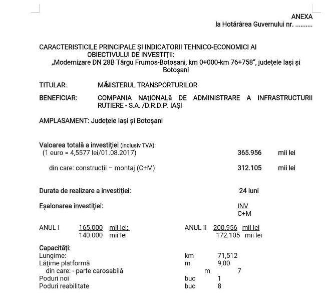 Astfel, în ședința de astăzi a executivului, a fost aprobată Hotărârea de Guvern pentru aprobarea indicatorilor tehnico-economici aferenți obiectivului de investiții „Modernizarea DN 28B Botoșani - Târgu Frumos” în lungime de 76 de km. În același timp, în comisiile reunite de buget-finanțe ale Parlamentului a fost aprobat, tot azi, amendamentul adus la Legea bugetului de stat privind alocarea finanțării necesare în 2018 pentru demararea proiectului.