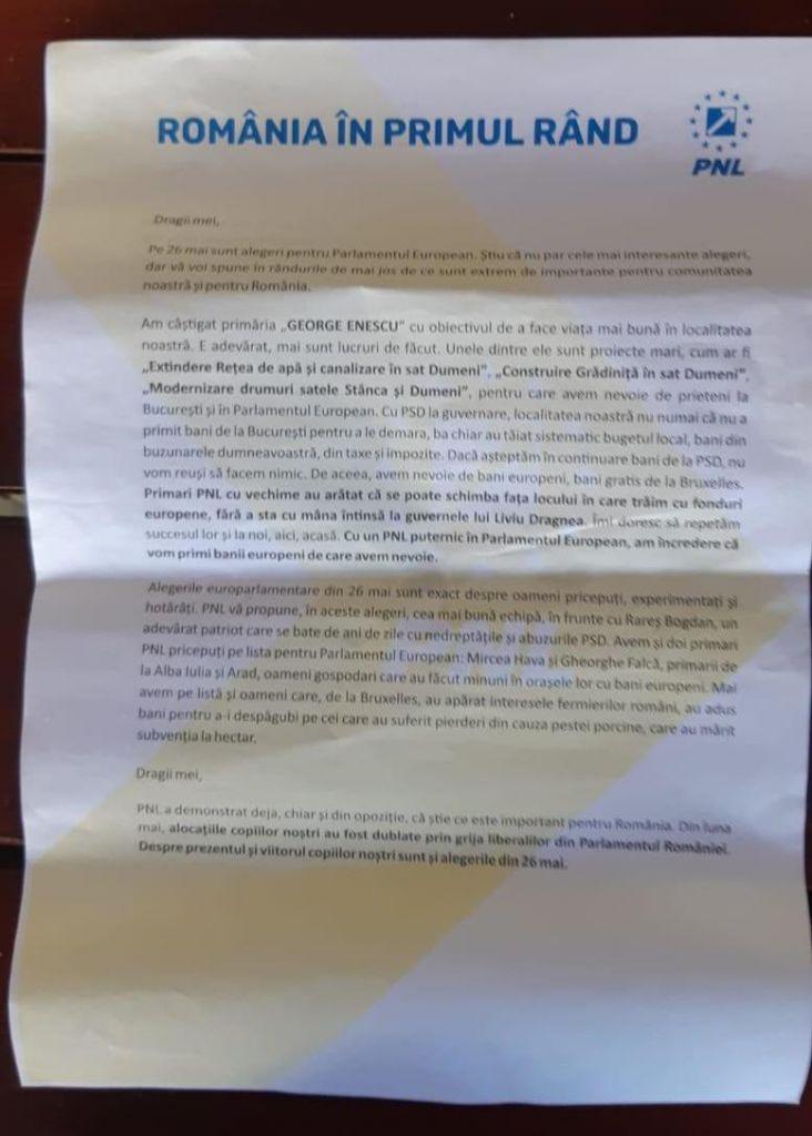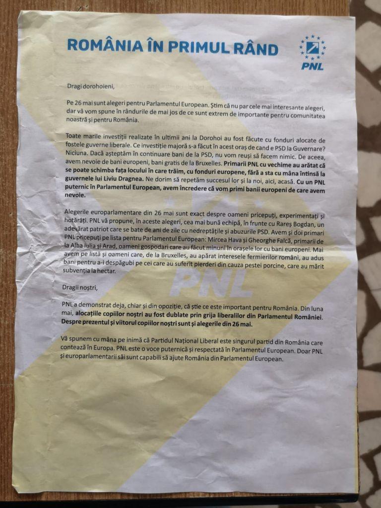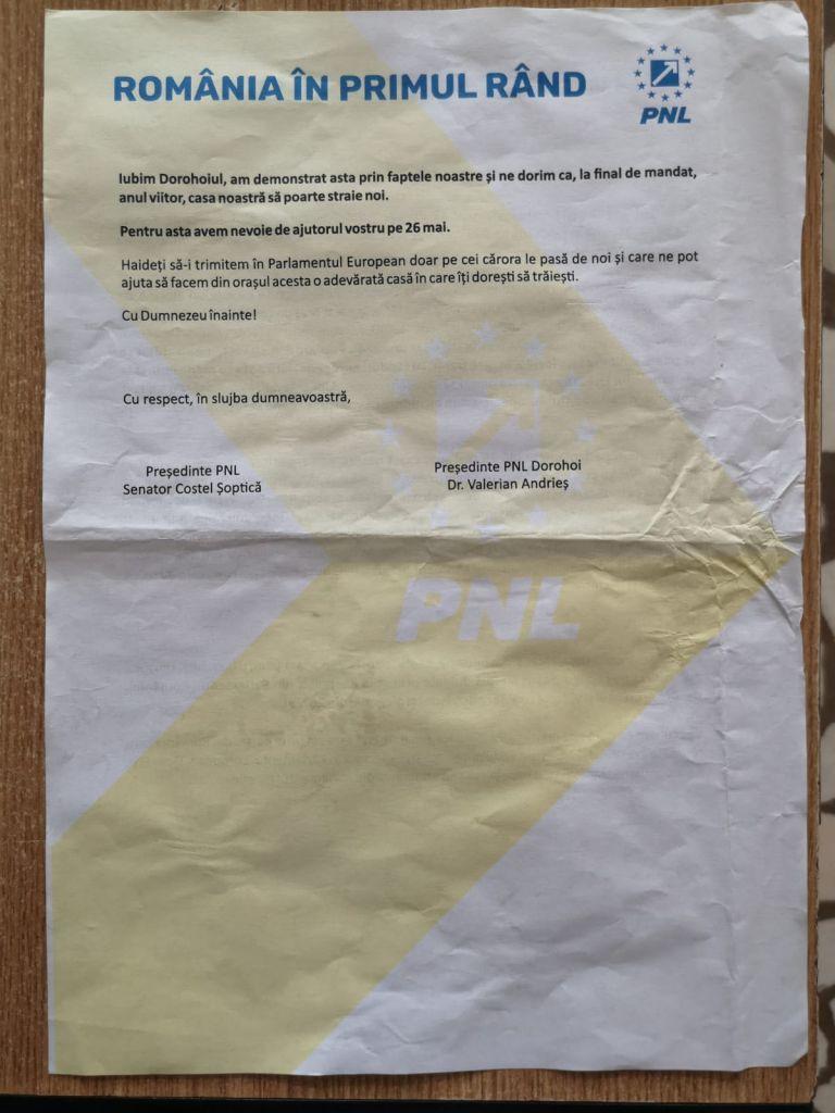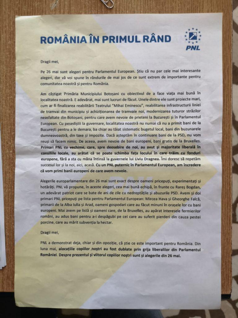 Botoșănenii din municipiul Botoșani și din mai multe zone ale județului au adus la sediul PSD Botoșani mai multe materiale de propagandă electorală prin care sunt promovați candidații PNL pentru Parlamentul European, care nu respectă legislația în domeniul electoral. Toate tipăriturile cu PNL au fost împărțite în perioada campaniei electorale și nu înainte, dovada fiind toate persoanele care le-au primit în mână pe stradă, cât și la cutia poștală, în ultimile zile.