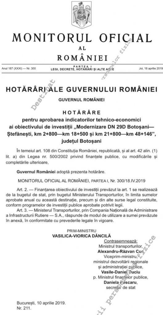 Reprezentanții PSD Botoșani au prezentat dovada video a aprobării Hotărârii de Guvern adoptată în ședința din 10 aprilie 2019, semnată de Viorica Dăncilă și publicată în Monitorul Oficial nr. 300 din 18 aprilie 2019 în care este aprobată finanțarea pentru modernizarea drumului Botoșani-Ștefănești DN29. În urmă cu câteva zile, Compania Națională de Administrare a Infrastructurii Rutiere a anunțat că s-au încheiat procedurile de evaluare și a fost stabilit un constructor pentru refacerea drumului național DN 29D, Botoșani - Ștefănești.