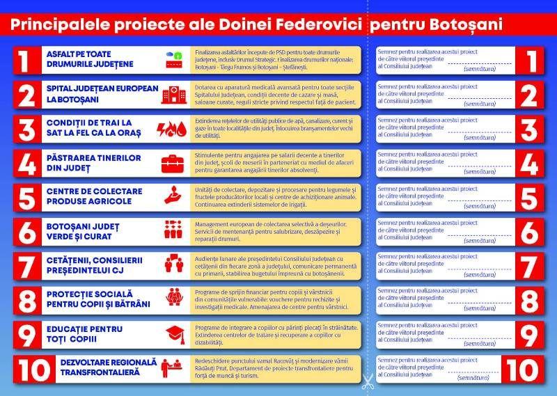 Organizațiile PSD din fiecare comună și oraș din județul Botoșani îi consultă pe botoșăneni cu privire la proiectele prioritate pentru următorii 4 ani. Toate opțiunile strânse de la cetățeni vor fi centralizate și comunicate public. Prioritățile botoșănenilor vor deveni prioritățile candidaților social-democrați.