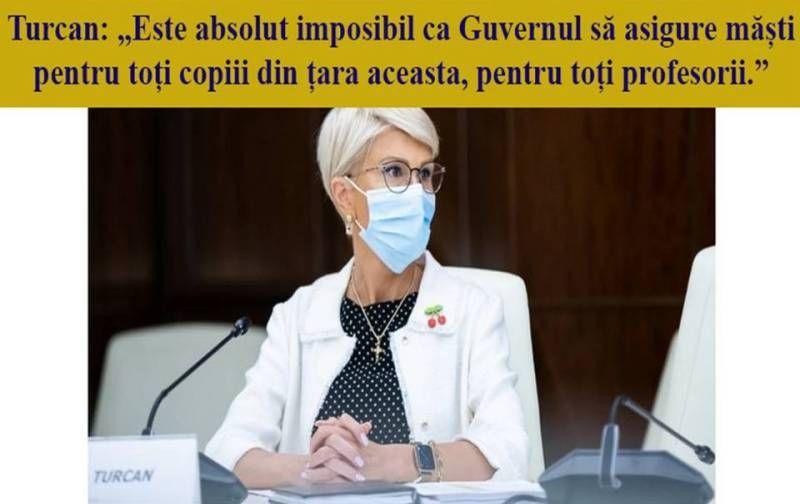 Săptămâna trecută vicepremierul Raluca Turcan nominalizată de Ludovic Orban să se ocupe de domeniul educației a declarat: „Din perspectiva Guvernului, noi punem bani la dispoziţie autorităţilor publice locale, să facă un stoc minim de măşti şi materiale dezinfectante în fiecare şcoală, pentru situaţii de avarie, să spunem, îşi uită măscuţa copilul, e dintr-o familie mai săracă, i s-au terminat măştile, însă este absolut imposibil ca Guvernul să asigure măşti pentru toţi copiii din ţara aceasta, pentru toţi profesorii.”
