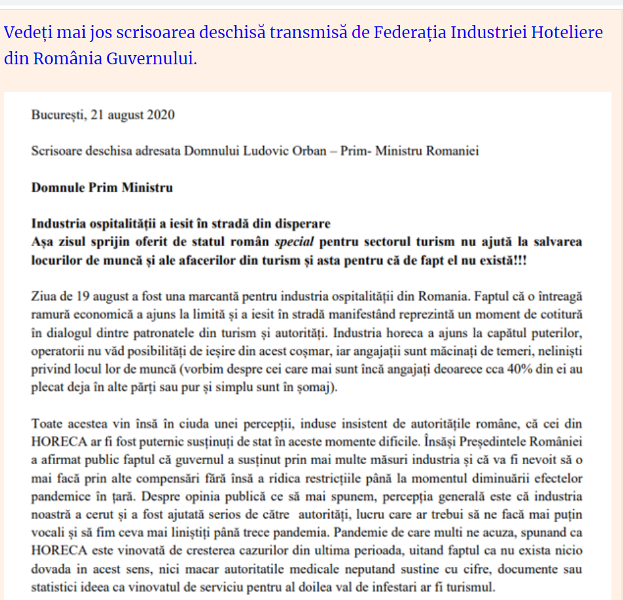 Săptămâna trecută, membrii organizației patronale HORA din industria ospitalității și-au suspendat activitatea, iar patronatele și angajații din această industrie au trimis la Guvern o scrisoare prin care atrag atenția că pentru ei nu s-a luat nicio măsură din partea statului, care i-a închis și în schimb nu le-a oferit niciun fel de sprijin.