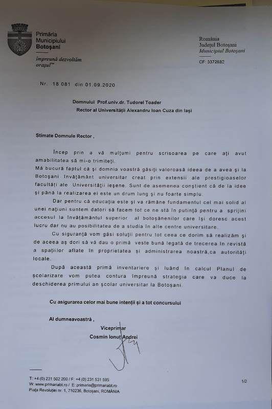„Marți, pe 1 septembrie am trimis o adresă oficială domului rector al Universității Alexandru Ioan Cuza din Iași pentru a-l asigura de disponibilitatea mea și a colegilor pentru începerea procedurilor logistice cu privire la identificarea și stabilirea unor spații dedicate facultăților care urmează să se înființeze ca extensie a celor de la Iași din domeniul informaticii, economiei și științelor umaniste. Am început să mă ocup de inventarierea clădirilor din subordinea primăriei, astfel încât în cel mai scurt timp să trecem la etapa de acreditare a programelor de studii și de invitarea conducerii Universității Cuza, aici la Botoșani pentru prima vizită de lucru”, a declarat Cosmin Andrei.