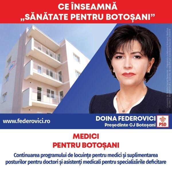 „La nivelul Consiliului Județean am pregătit programul „SĂNĂTATE PENTRU BOTOȘANI”, care are o componentă dedicată pentru realizarea de noi locuințe de serviciu pentru medici și suplimentarea posturilor pentru doctori și asistenți medicali pentru specializările deficitare la nivel de județ. De asemenea în cadrul acestui program vom continua investițiile pentru dotarea cu aparatură medicală avansată pentru toate secțiile interioare și exterioare de la Spitalul Județean și reabilitarea clădirilor pentru secțiile de Pediatrie, Obstetrică-Ginecologie, Urgențe și Ambulatoriul de zi”, a declarat Doina Federovici.