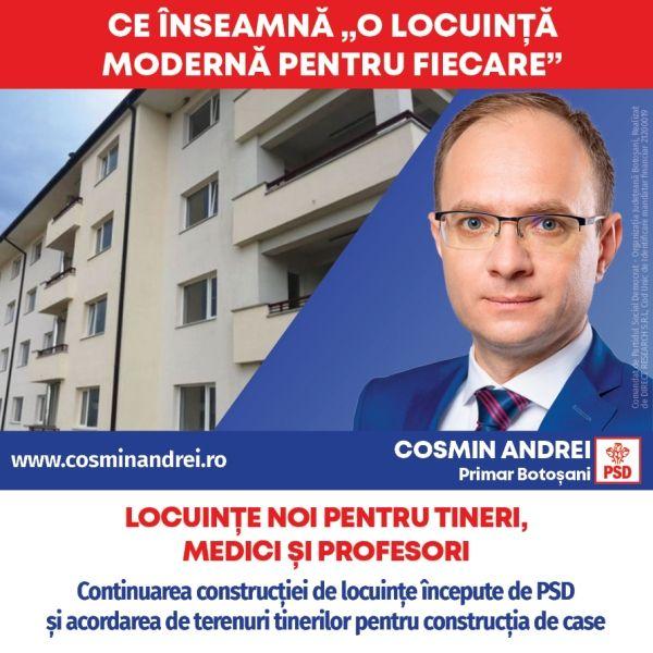 „O LOCUINȚĂ MODERNĂ PENTRU FIECARE” este programul meu pentru continuarea construcțiilor de blocuri ANL pentru tineri, aprobate și finanțate în Guvernarea PSD și reabilitarea termică a blocurilor vechi de locuințe din municipiu prin fonduri europene, pe care primarul Flutur nu a fost în stare să le aducă la Botoșani pentru acest domeniu. Tinerii trebuie să aibă motive serioase să rămână și să-și întemeieze o familie aici la Botoșani. Toți botoșănenii merită să locuiască în condiții decente și să plătească o întreținere mică pentru căldură în sezonul de iarnă. Vom porni și Programul de locuințe pentru medici și profesori. În ceea ce privește tinerii pe lângă apartamentele în regim ANL voi acorda terenuri gratuite familiilor la început de drum pentru construcția de case”, a declarat Cosmin Andrei.