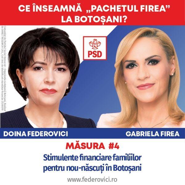 „O parte dintre măsurile aplicate de doamna Firea la București, care pot fi realizate și de Consiliul Județean le-am preluat în programul meu. Aici mă refer la stimulente financiare pentru părinți la nașterea fiecărui copil și programe de consultații și controale medicale pentru botoșănenii din comunitățile vulnerabile din județ, în parteneriat cu Direcția Asistență Socială și Protecția Copilului, Spitalul Județean, Direcția de Sănătate Publică și primăriile din județ. Avem o strategie coerentă pentru creșterea accesului la servicii medicale și educaționale a copiilor din județul nostru”, a declarat Doina Federovici.