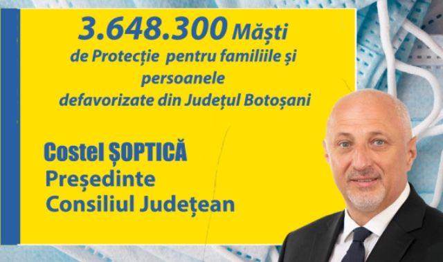 „Ministerul Sănătății, prin Direcția de Sănătate Publică Botoșani, a repartizat către toate primăriile din județ măști de protecție pentru persoanele defavorizate. Așadar, toți botoșănenii care figurează în evidențele administrațiilor publice locale ca având o situație financiară precară primesc sprijin din partea Guvernul liberal. Facem ce trebuie făcut pentru binele populației, cu maximă responsabilitate”, a declarat senatorul Costel Șoptică, președintele PNL Botoșani și candidat la funcția de președinte al Consiliului Județean Botoșani,