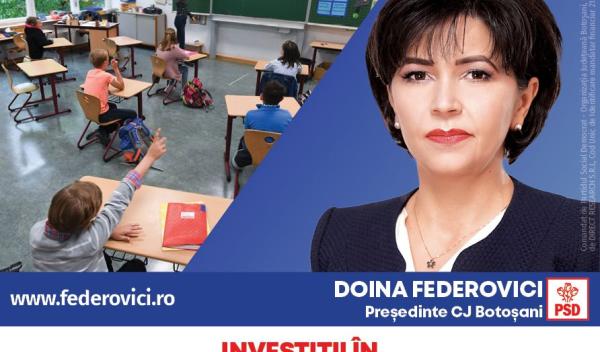 „Așa cum am promis în 2016, ne-am ținut de cuvânt și prin Guvernul PSD au fost alocate fonduri pentru modernizarea infrastructurii școlare, construcția de școli și grădinițe și dotarea cu echipament didactic a unităților de învățământ din județul Botoșani. Din funcția de președinte al Consiliului Județean Botoșani voi continua investițiile în educație, atât pentru reabilitarea și amenajarea școlilor și grădinițelor, cât și pentru susținerea tinerilor noștri prin introducerea învățământului profesional dual în Botoșani, în parteneriat cu mediul de afaceri local, cu scopul formării profesionale și dobândirea unei meserii”, a declarat Doina Federovici.