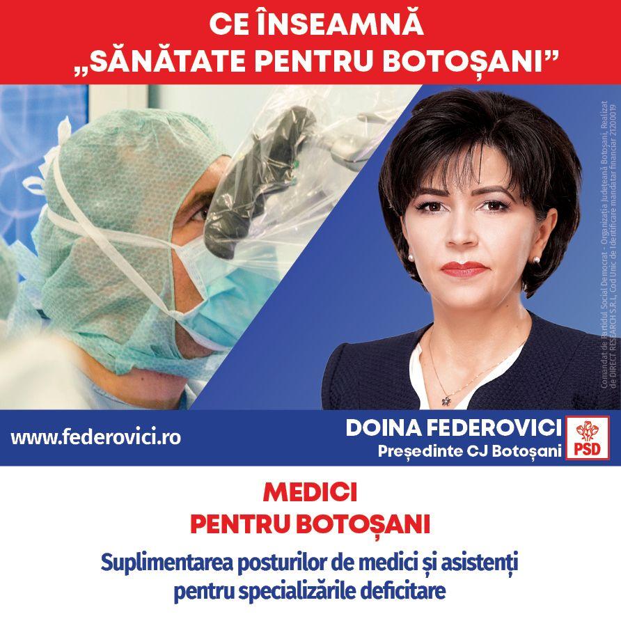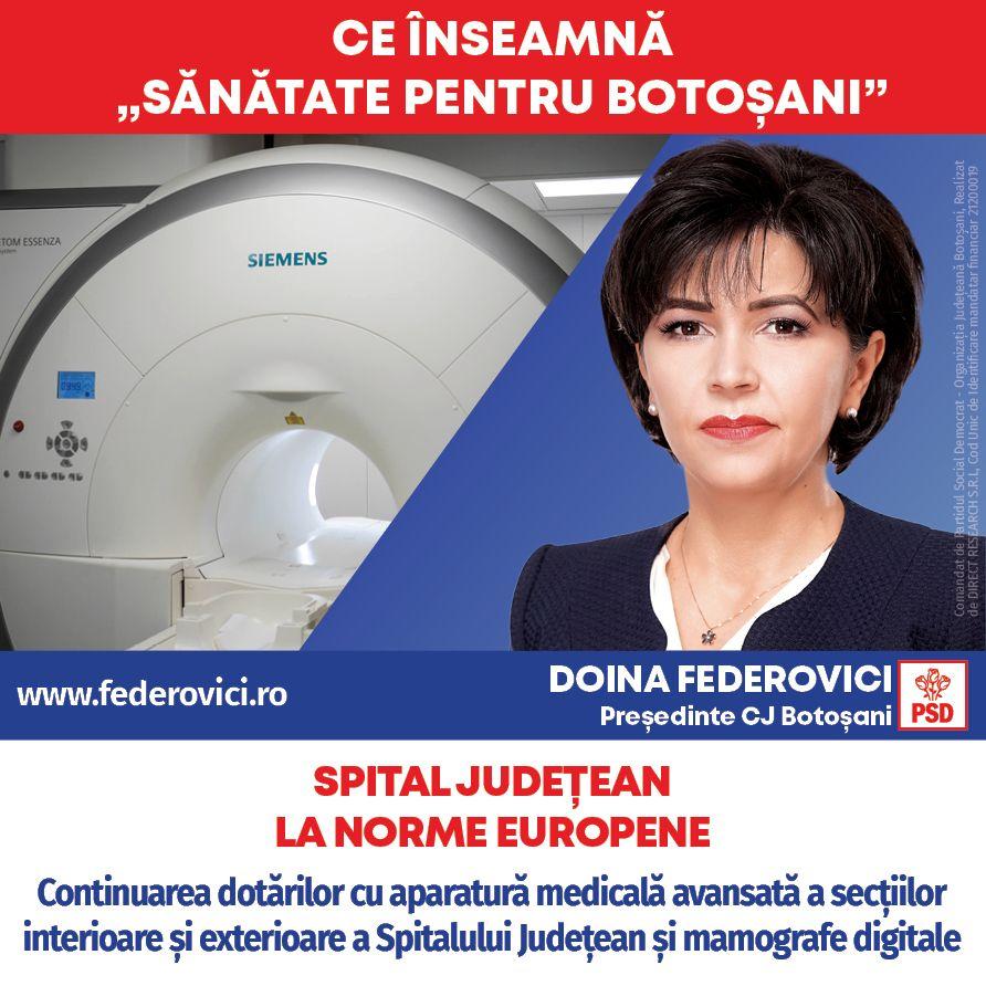 „Împreună cu echipa de specialiști în sănătate și cu toți consilierii județeni am pregătit cel mai mare program pentru realizarea de investiții în infrastructura medicală din Botoșani. Vom continua toate obiectivele din domeniul sanitar pe care le-a început echipa PSD la Consiliul Județean și care au fost susținute de Guvernarea social-democrată, prin Programul „Sănătate pentru Botoșani”. Acest lucru înseamnă, că vom achiziționa aparatură medicală avansată pentru toate secțiile interioare și exterioare de la Spitalul Mavromati și vom finaliza reabilitarea clădirilor pentru secțiile de Pediatrie, Obstetrică-Ginecologie, Urgențe și Ambulatoriul de zi”, a declarat Doina Federovici.
