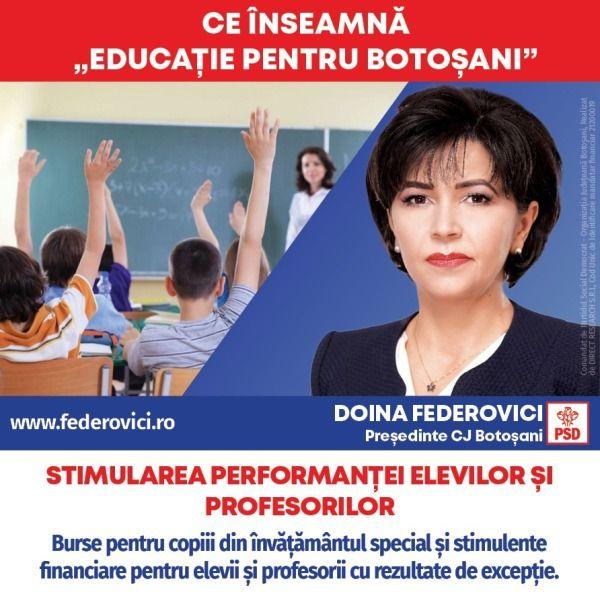 „În toată activitatea mea politică am înțeles că un primar sau un președinte de Consiliu Județean nu trebuie să se limiteze doar la îmbunătățirea aspectului orașului sau județului, ci trebuie să se ocupe și de bunăstarea cetățenilor și de viitorul tinerilor și copiilor, de îmbunătățirea sistemului de sănătate, de creșterea calității în educație, de încurajarea tinerelor familii, de crearea de locuri de muncă pentru cei activi și de sprijinirea celor în vârstă. De aceea, doresc să pun în aplicare la Consiliul Județean un program de burse pentru copiii din învățământul special și stimulente financiare elevilor și profesorilor cu rezultate de excepție. Performanța copiilor și cadrelor didactice din Botoșani trebuie încurajată și oferită ca model pentru toată lumea”, a declarat Doina Federovici.