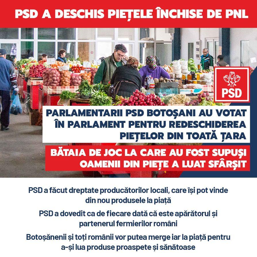 Parlamentarii PSD din toată țara, inclusiv cei din Botoșani s-au mobilizat ieri și au votat modificarea imediată a legislației pentru a permite deschiderea tuturor piețelor care permite pe de o parte supraviețuirea micilor producători locali, iar pe de altă parte accesul la hrană proaspătă și sănătoasă pentru toți românii.