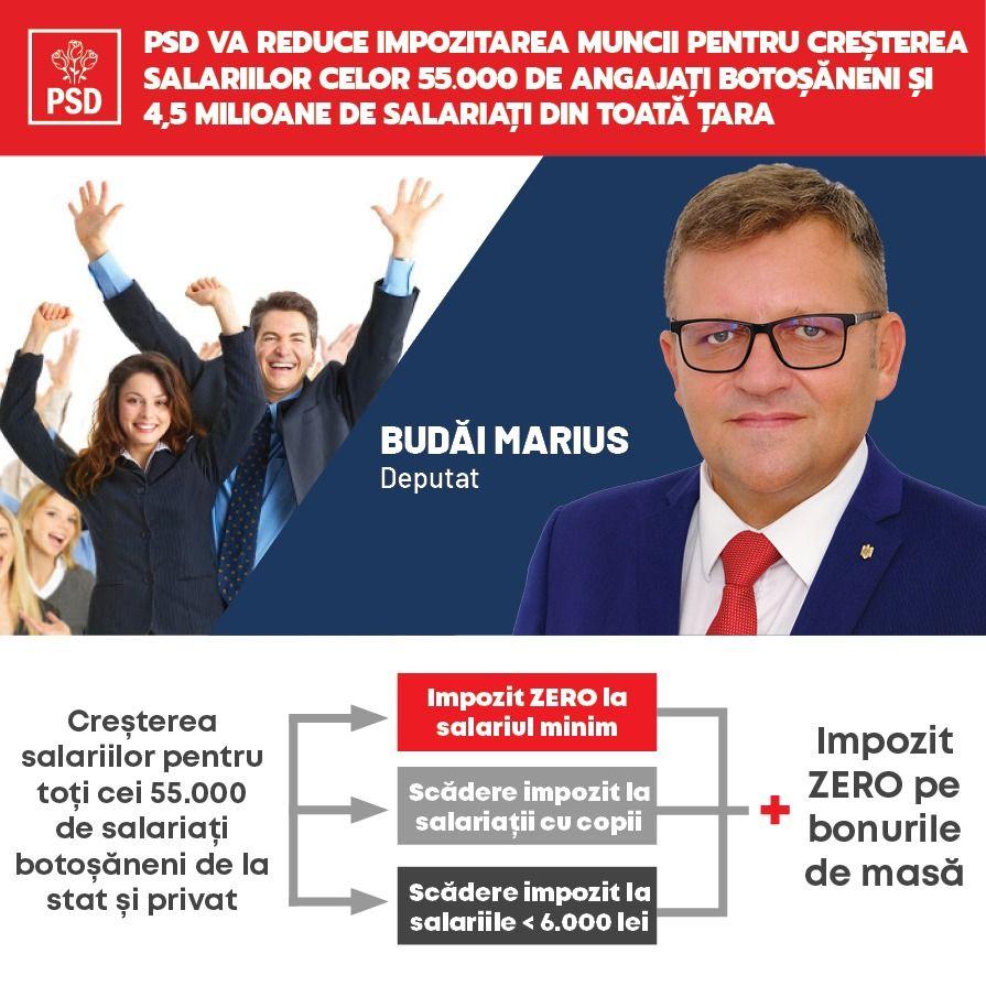 „PSD va reduce impozitarea muncii și astfel va determina creșterea salariilor pentru toți angajații din județul Botoșani, atât din mediul public, cât și din zona privată. Astfel, pentru 35.000 de botoșăneni, care au salariul minim, impozitul va fi zero, iar pentru 20.000 dintre aceștia, impozitarea va fi redusă cu 85%. La nivel național mai mult de 4,5 milioane de angajați vor beneficia de creșterea salariilor în urma aplicării măsurilor de reducere a impozitărilor pe venituri. Prioritatea noastră pentru următorii patru ani este păstrarea locurilor de muncă și creșterea sigură a veniturilor românilor, așa cum a fost de fiecare dată când noi am fost la guvernare. În timp ce PNL şi USR nu propun nimic, PSD vine în fata românilor cu soluții concrete, cu măsuri țintite, corecte, simple, pentru tinerii care nu-și mai găsesc o slujbă după ce au fost concediați, pentru persoanele peste 55 de ani, pentru cele din grupurile dezavantajate, precum și cu un program privind stimularea natalității care poate rezolva problema demografică din fiecare județ, inclusiv din Botoșani”, a declarat Marius Budăi.
