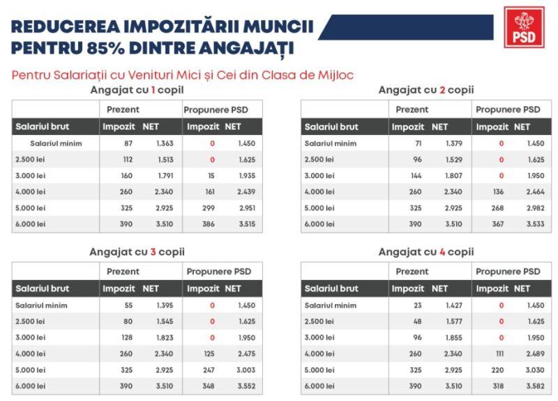 Programul fiscal propus de PSD prevede creșterea salariilor la 85% dintre angajații din România prin impozit ZERO la salariul minim și scăderea impozitării la salariații cu copii și la cei cu veniturile sub 6.000 de lei pe lună. De asemenea, va fi impozit ZERO pe bonurile de masă primite de angajați prin includerea acestora în categoria veniturilor neimpozabile.