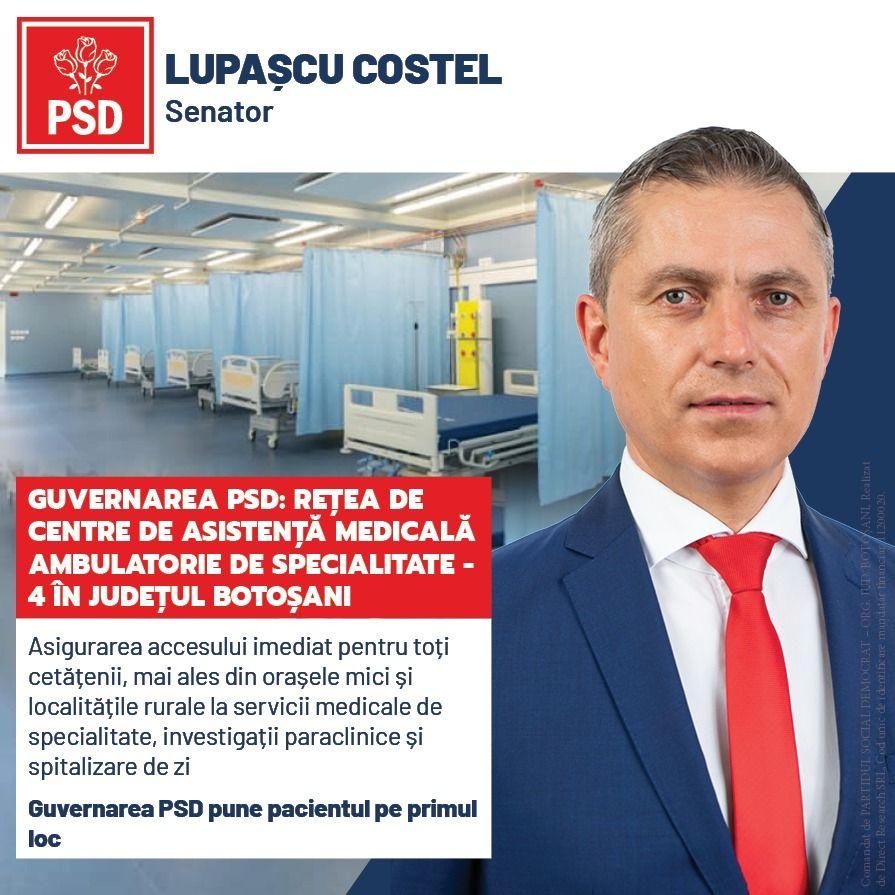 „Guvernarea PSD pune pacientul pe primul loc. De aceea, am venit în fața botoșănenilor și a tuturor românilor cu o strategie coerentă cu soluții concrete prin care să refacem cu totul sistemul de sănătate. Vom asigura acces neîngrădit la toate medicamentele esențiale și tratamentele pentru pacienții din programele naționale prin reevaluarea politicii medicamentului și încurajarea producției autohtone de produse farmaceutice. Vom înființa centre de asistență medicală ambulatorie pentru pacienții din zona rurală și din orașele care sunt mai departe față de reședința de județ. Vom crește numărul contractelor cu farmaciile din mediul rural, precum şi aprovizionarea cu unități mobile în zonele izolate”, a declarat Costel Lupașcu.