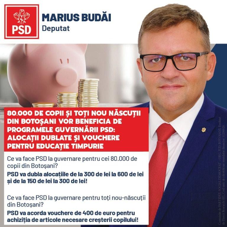 „PSD, așa cum a procedat de fiecare dată, fie de la guvernare, fie din Parlament a inițiat și promovat programe pentru susținerea familiilor și copiilor. Așadar, PSD imediat cum va ajunge să guverneze, va dubla alocațiile pentru copii și va acorda vouchere de 400 de euro la nașterea fiecărui copil pentru acoperirea cheltuielilor cu creșa și achiziția articolelor necesare creșterii minorilor pentru părinții care muncesc. De asemenea, fiecare familie va putea obține un credit cu dobândă mică, subvenționată de guvern, pentru achiziția sau renovarea unei locuințe. Programul PSD mai prevede și creșterea stimulentului pentru mamele care se întorc mai devreme în câmpul muncii și vouchere pentru rechizitele elevilor care provin din medii vulnerabile. Noi venim la guvernare cu soluții pentru copiii noștri, nu închidem școlile, nu îi lipsim de educație pe cei din mediul rural, nu îi lăsăm în voia sorții pe copiii, fără niciun fel de apărarea împotriva COVID-ului”, a declarat Marius Budăi.