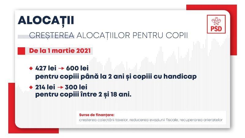 Amendamentul PSD prevede majorarea alocațiilor de la 1 martie 2021 la nivelul prevăzut inițial în Legea dublării alocațiilor nr. 14/2020. Astfel, alocațiile ar urma să crească după cum urmează: de la 214 lei la 300 de lei pentru copiii între 2 și 18 ani și de la 427 lei la 600 de lei pentru copiii sub 2 ani sau copiii cu dizabilități.