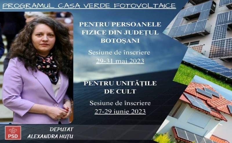 „Îi încurajez pe toți botoșănenii care locuiesc la case și doresc să reducă facturile la consumul de curent electric să apeleze cu încredere la acest program gestionat de Administrația Fondului pentru Mediu. AFM acordă pentru fiecare proiect eligibil finanțare de 20.000 de lei, iar beneficiarii trebuie să asigure o cofinanțare de 2000 de lei, însă dacă cineva vrea să extindă capacitatea sistemului instalat peste 3 KW, va achita suplimentar diferenţa de putere. Regiunea Nord Est - judeţele Bacău, Botoşani, Iaşi, Neamţ, Suceava şi Vaslui are alocată suma de 279.480.000 lei, fiind al doilea cel mai mare buget din cele 8 regiuni. Potrivit calendarului, botoșănenii au la dispoziție trei zile în care se pot înscrie în aplicația AFM: 29, 30 și 31 mai.” a transmis deputatul PSD Alexandra Huțu.