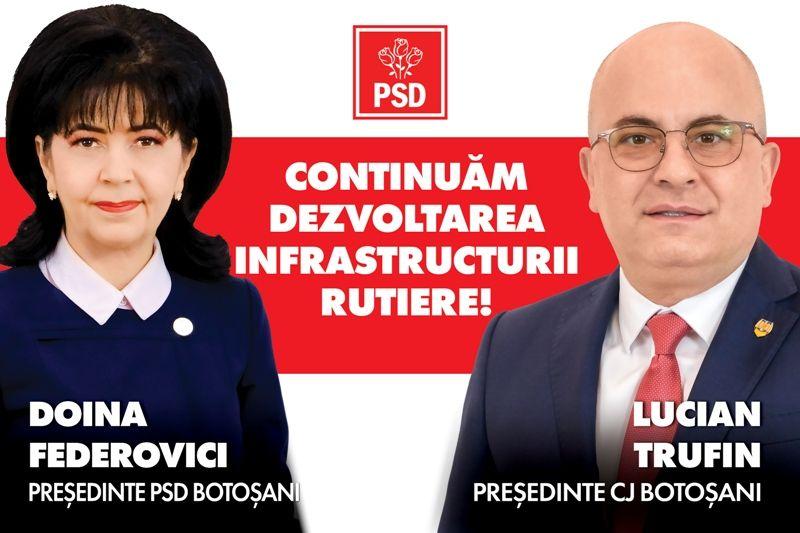 „Un județ cu o infrastructură rutieră precară nu poate emite pretenții de dezvoltare, motiv pentru care, împreună cu echipa PSD și cea de la Consiliul Județean, am conturat un program de modernizare a drumurilor județene de care ne-am ținut cu strictețe. Astfel, în cei trei ani și jumătate de mandat s-au modernizat și reabilitat 210 kilometri de drum județean. Consiliul Județean Botoșani este singurul din Regiunea de Nord-Est a țării care a finalizat Drumul Strategic și a atras toți banii europeni. De asemenea, am asfaltat sectorul Prăjeni – Plugari, care asigură o alternativă mai rapidă drumului național spre Iași. Am modernizat Drumul «Mănăstirilor» și toate celelalte sectoare finanțate prin PNDL 2”, a declarat Doina Federovici, președintele Consiliului Județean și al PSD Botoșani, care este convinsă că senatorul Lucian Trufin este candidatul cel mai potrivit pentru a continua programul de modernizare a drumurilor județene.