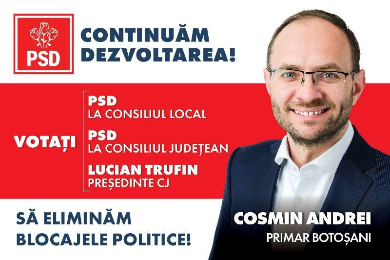 „Am învățat ca primar că dacă am o majoritate politică stabilă la municipiu și la județ, dacă am un coleg cu care să colaborez în continuare, cum e Lucian Trufin, la conducerea județului, atunci pot face mai multe schimbări în bine în Botoșani. De aceea le spun botoșănenilor care au încredere în mine să voteze PSD la consiliul local și județean și Lucian Trufin președinte al Consiliului Județean pentru accelerarea dezvoltării orașului nostru”, a încheiat social-democratul Cosmin Andrei.