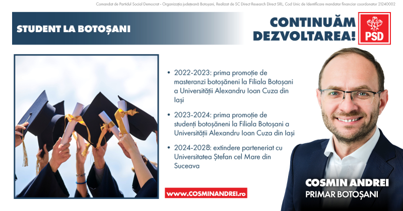 „Am promis în 2020, alături de colegii mei Doina Federovici și Marius Budăi că voi aduce la Botoșani o universitate pentru ca tinerii din orașul nostru să aibă posibilitatea să învețe acasă la ei. Am reușit să deschidem Filiala Botoșani a Universității Alexandru Ioan Cuza din Iași. Avem deja prima promoție de studenți la programele de licență și de master. Cel mai important este că absolvenții de liceu din Botoșani pot continua studiile universitare aici, iar părinții nu mai trebuie să suporte cheltuieli de transport, masă și cazare în județele învecinate. Mai mult decât atât, dacă se angajează după terminarea liceuluui și vor să urmeze și studii superioare, o pot face mult mai ușor dacă au și locul de muncă și facultatea în același oraș”, a declarat Cosmin Andrei.