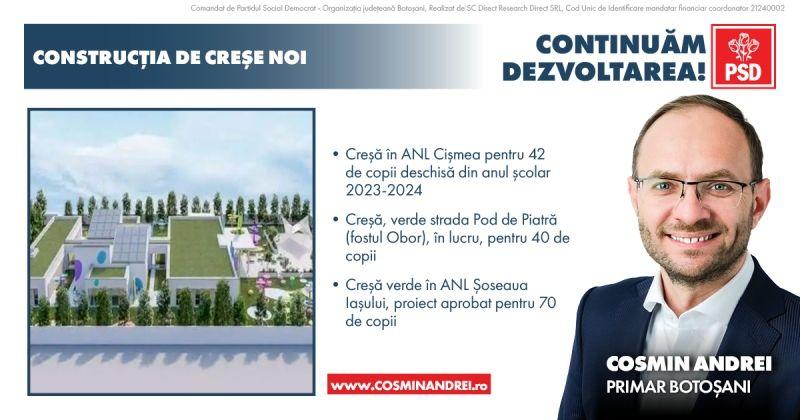 „Așa cum am promis și am deschis de anul trecut creșa nouă în ANL Cișmea pentru 42 de copii, la fel voi face și în cazul creșei care se construiește acum în zona fostului Obor pe strada Pod de Piatră. Am fost pe șantier să văd cum evoluează lucrările, în doar câteva săptămâni s-a ajuns la turnarea fundației clădirii. Construcția este în grafic. Anul viitor vom avea a doua creșă nouă în municipiul Botoșani din ultimii 34 de ani. Va fi o construcție modernă, cu un consum redus de energie, cu dotări și echipamente la standarde europene. Sunt părinte și știu foarte bine cât de important este pentru părinți să își poată lăsa copilul în siguranță pentru a fi îngrijit și pentru a beneficia de cele mai bune condiții în primii ani de viață”, a declarat Cosmin Andrei.
