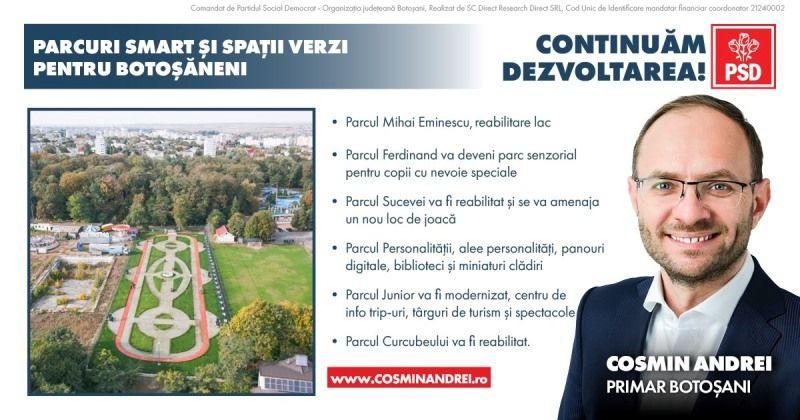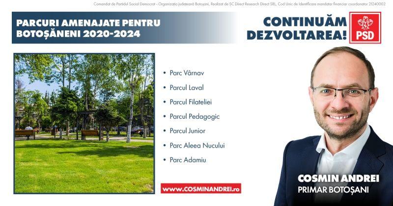 În mandatul 2020-2024 administrația PSD Cosmin Andrei a reabilitat, modernizat și înființat mai multe parcuri din municipiul Botoșani: Parc Vârnav, Parcul Laval, Parcul Filateliei, Parcul Pedagogic, Parcul Junior, Parcul de pe Aleea Nucului, Parcul Adamiu.