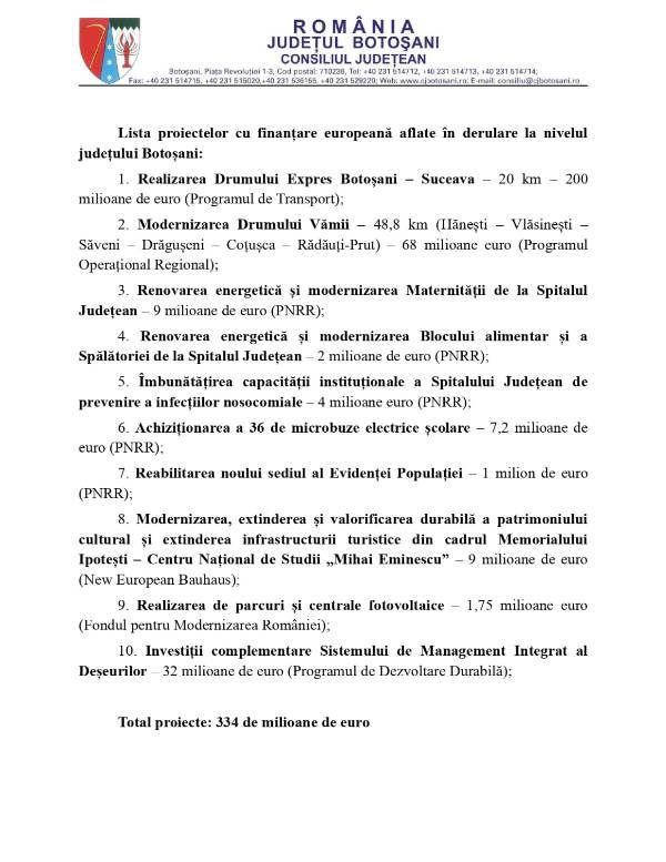 „Cum a spus și doamna președinte a Consiliului Județean Botoșani, aici nu e o chestiune de orgoliu sau de competiție electorală. E vorba de bani europeni deja obținuți pentru județul nostru prin munca doamnei Doina Federovici. Tot ce trebuie să facem e să ducem proiectele la bun sfârșit pentru a deconta fondurile europene care ne-au fost deja alocate. Cunosc bine aceste proiecte pentru că le-am discutat în amănunt cu doamna președinte a Consiliului Județean. Nu e nimic politic în ele. Sunt investiții în drumuri, investiții în sănătate, în educație și alte obiective importante”, susține candidatul PSD pentru șefia Consiliului Județean.