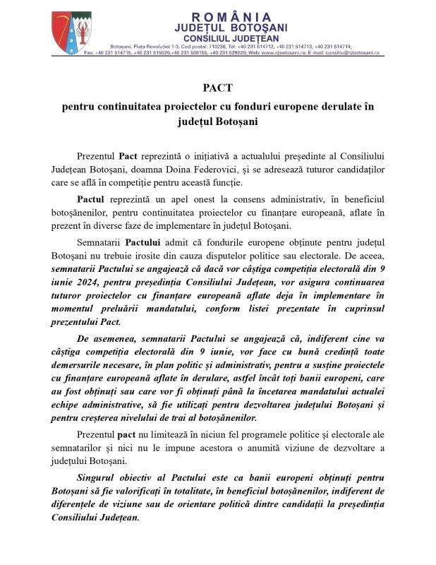 Cu câteva zile înainte de încheierea campaniei electorale, președintele Consiliului Județean Doina Federovici, care nu mai candidează pentru un nou mandat, le-a cerut tuturor candidaților care aspiră să-i urmeze la conducerea Consiliului Județean să semneze un „Pact pentru continuitatea proiectelor cu fonduri europene derulate în județul Botoșani”. Scopul demersului, spune Doina Federovici, este de a exista o garanție pentru botoșăneni că, indiferent cine va câștiga alegerile, nu se vor pierde cele 334 de milioane de euro care deja au fost obținute de actuala conducere a Consiliului Județean.