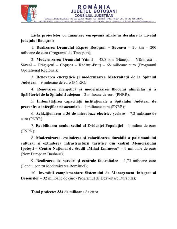 Consiliul Județean Botoșani are în prezent în derulare foarte multe proiecte cu fonduri europene, însă dintre acestea, cele mai importante 10 proiecte au fost incluse de Doina Federovici în „Pactul pentru continuitatea proiectelor cu fonduri europene derulate în județul Botoșani”.