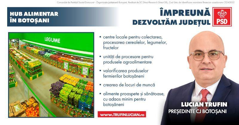 Unul dintre programele principale din oferta electorală a candidatului PSD pentru președinția Consiliului Județean Botoșani, Lucian Trufin, prevede înființarea unui așa-zis „HUB alimentar” în Botoșani care să faciliteze colectarea, sortarea și valorificarea produselor agroalimentare realizate pe plan local.