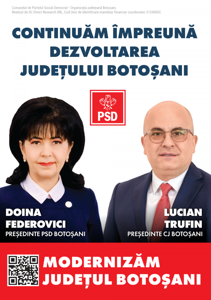 Comandat de Partidul Social Democrat - Organizația Județeană Botoșani, Realizat de SC Direct Research SRL, Cod Unic de Identificare mandatar financiar coordonator 21240002.