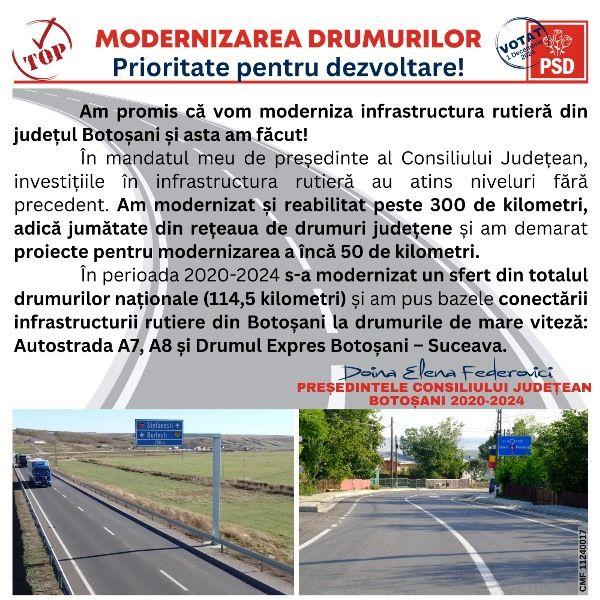 În timpul administrației Federovici, rețeaua de drumuri din județul Botoșani a cunoscut o dezvoltare fără precedent. „În ultimii patru ani, am modernizat și reabilitat peste 300 de kilometri, adică jumătate din rețeaua de drumuri județene și am demarat proiecte pentru modernizarea a încă 50 de kilometri. Investițiile în infrastructura rutieră sunt cele mai sigure pentru viitorul nostru, pentru că fără drumuri bune nu putem vorbi de atragerea investitorilor, de dezvoltarea zonei de business și implicit de crearea de locuri de muncă bine plătite”, a declarat Doina Federovici, președintele PSD Botoșani.