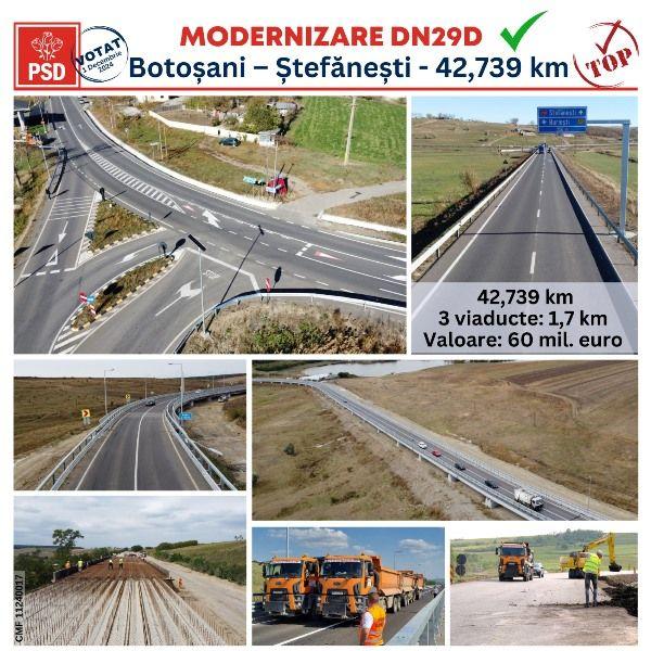 Nici drumurile naționale nu au fost neglijate, în ultimii ani finalizându-se două proiecte promovate de parlamentarii PSD, Botoșani – Târgu Frumos și Botoșani – Ștefănești. „Ne-am ținut de cuvânt și am modernizat cele două drumuri naționale importante ale județului nostru. Le mulțumesc colegilor parlamentari, domnului ministru al Transporturilor, Sorin Grindeanu, și reprezentanților DRDP pentru că au susținut și găsit soluțiile pentru implementarea acestor investiții. Împreună am reușit să trecem peste votul împotrivă dat de parlamentarii PNL, atunci când în Parlament s-a dezbătut amendamentul la Legea bugetului, care să permită finanțarea acestor investiții. Liberalii au știut doar să se laude, dar când au trebuit să facă ceva și pentru județul nostru au dat înapoi”, a subliniat liderul social-democraților botoșăneni, Doina Federovici.