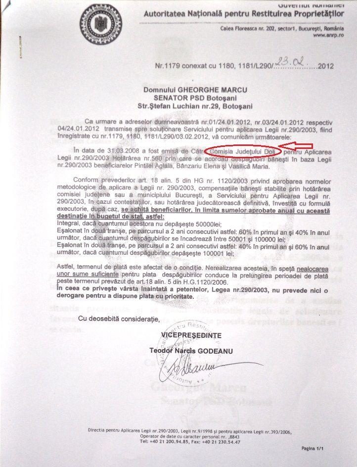 „Ca să vedeţi incompetenţa actualilor guvernanţi, vă dau un exemplu în care am făcut o adresă către Autoritatea Naţională pentru Restituirea Proprietăţilor, autoritate aflată în subordinea Guvernului României. Prin aceasta solicitam ca să ajute trei doamne din Dorohoi, care şi ele la rândul lor m-au rugat să obţină acele sume de bani reprezentând contravaloarea proprietăţilor pe care le-au deţinut. Am trimis aceste adrese şi am primit răspuns, semnat de către vicepreşedintele Teodor Narcis Godeanu şi ca să vedeţi proba de incompetenţă şi treaba făcută foarte superficial, veţi observa în cuprinsul adresei(FOTO2) că mă trimite la Comisia Judeţului Dolj. Aşa se rezolvă anumite doleanţe ale cetăţenilor din Romania.”, a adăugat Senatorul Gheorghe Marcu. (DorohoiNews.ro, Andrei B.)