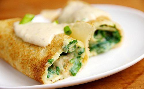 Umplutura de spanac: Incalzeste untul intr-o tigaie, adauga faina si amesteca timp de cateva minute. Adauga treptat laptele, amestecand pana se formeaza un sos alb omogen. Asezoneaza cu sare si piper si adauga smantana. Incalzeste uleiul intr-o oala mica, prajeste ceapa si asezoneaza. Amesteca ceapa cu spanacul, adauga parmezanul si sosul alb. Asezoneaza daca este necesar si lasa deoparte. Incalzeste cuptorul la 180 de grade Celsius. Incalzeste uleiul intr-o tigaie si pune aluatul cu lingura. Prajeste pe o parte pana ce acesta devine auriu, intoarce si prajeste si pe cealalta parte. Repeta procedura pana termini aluatul. Pune umplutura de spanac pe fiecare clatita, presara mozzarella si impatureste. Pune clatite intr-o tava de copt unsa si lasa la cuptor timp de 15 minute. Se servesc cu salata verde.
