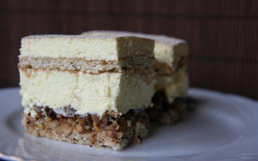 Mod de preparare: Intr-o tava tapetata cu hartie de copt, folie de aluminiu, se pune nuca tocata si se distribuie uniform. Bateti albusurile spuma cu un praf de sare, apoi adauga zaharul treptat si bateti pana la diluarea zaharului. Adauga faina amestecata cu praful de copt, pesmetul si nuca, peste albusuri, omogenizeaza amestecand usor de jos in sus. Compozitia obtinuta o distribui, lingura cu lingura, peste nuca din tava, cu grija sa nu strici stratul nu nuca, nivelezi frumos si bagi tava in cuptorul preincalzit, la foc mic, pentru aprox. 25 minute. Blatul trebuie sa capete o culoare aurie. Fierbinte il rastorni pe un platou, ii desprinzi folia si intinzi crema de ciocolata pe blatul cald. Lasi sa se racoreasca apoi dai la frigider. Intre timp prepara crema. Galbenusurile amesteca-le cu zaharul si laptele si fierbe-le impreuna, intr-un vas cu fund dublu, la foc mic si amestecand continuu, pana capata consistenta unei smantani. Frisca mixeaz-o cu smantana, zaharul si zaharul vanilat. Raceste bine amestecul de galbenusuri, adauga-l peste frisca, lingura cu lingura, mixand la prima treapta a mixerului pana la omogenizare. Scoate blatul de la rece, intinde jumatate din cantitatea de crema, distribuie apoi un strat de biscuiti inmuiati bine in cafea, intinde si restul de crema, niveleaza frumos si pudreaza cacao. Da prajitura la rece pentru cateva ore apoi portioneaz-o cum doresti.