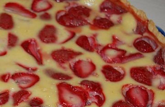 Mod de Preparare: Pregatim robotul de bucatarie pentru framantat. Punem untul in vasul robotului. Pastram 3 linguri de faina (adica 60 gr.), iar restul (200 gr.) le punem peste unt. Mixam pana cand obtinem o compozitie sfaramicioasa. Adaugam oul si o lingura de zahar (25 gr.) si continuam sa mixam pana cand obtinem o bila de aluat. Punem aluatul intr-un bol, pe care il acoperim cu folie alimentara si il introducem in frigider pentru 30 de minute. Punem cele 3 linguri de faina intr-un alt bol. Adaugam cele 150 gr. de zahar ramase, cele 3 oua, esenta de vanilie si smantana. Amestecam pana cand obtinem o crema fina. Taiem fiecare capsuna in 2, 3 sau 4 felii, in functie de cat de mare este aceasta. Incalzim cuptorul. Pregatim o forma pentru tarta, cu peretii detasabili si cu diametrul de 28-30 cm. Dupa 30 de minute, scoatem aluatul din frigider si il intindem cu un sucitor, dinspre centru spre exterior, rotind din cand in cand foaia de aluat. Daca aluatul este prea rece nu se va putea intinde si foaia de aluat se va rupe, iar daca nu s-a racit suficient se sa lipi de masa de lucru. Intindem pana cand diametrul aluatului este mai mare cu aproximativ 7 cm., fata de cel al formei pentru copt. Rulam aluatul usor pe sucitor si il punem in tava pregatita. Apasam usor, astfel incat aluatul sa se muleze pe forma pentru tarta. Ridicam marginile minim 3 cm., pe peretii formei, apoi taiem drept si indepartam marginile superioare de aluat inegale. Adaugam deasupra capsunile si le aranjam uniform. Turnam sufleul de smantana peste capsuni. Introducem tava in cuptorul incalzit pentru 40 de minute. Cand tarta este aurie pe margini, o scoatem din cuptor. Dupa ce prajitura s-a racit complet, desfacem marginile formei detasabile. Transferam desertul pe o farfurie si taiem in felii.