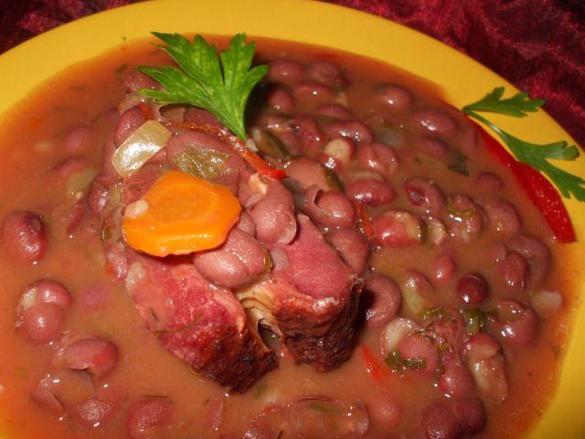 Mod de Preparare: Puneti intr-o oala mare fasolea pestrita impreuna cu ciolanul, avand grija ca apa sa le acopere cu cel putin 5 cm. Lasati-le sa fiarba la foc mic 2 ore. Verificati din cand in cand pentru a controla nivelul apei si mai adaugati apa calda, daca este cazul. Apoi puneti ceapa, ardeii grasi, ardeii iuti, usturoiul. Mai lasati-le sa fiarba cel putin o ora; verificati nivelul apei. Adaugati sare, piper, boia si mai fierbeti 20-30 minute.