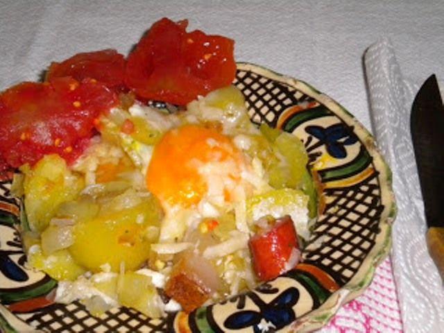 Mod de Preparare: Cartofii se spala si se fierb in coaja 30 de minute, in apa cu sare. Intre timp se taie ceapa nu prea marunt, se taie bucatele cabanosul si slanina afumata si se pun toate la calit in ulei pana cand ceapa se moaie si se rumenesc carnatii si slanina. Dupa ce se racesc cartofii, se curata de coaja, se taie felii mai marisoare si se pun intr-o tava unsa bine cu ulei sau cu unt, se da sare si piper apoi se pune deasupra amestecul de ceapa, slanina si carnati. Usturoiul curatat si taiat bucatele se presara peste compozitia din tava. Cu dosul lingurii se fac 4 sau 8 cuiburi si se sparg ouale. La urma se pune parmezanul ras si se da tava la cuptorul bine incins in prealabil, aproximativ 20 de minute, sau pana cand sunt gata ouale si este topit parmezanul de deasupra. Se serveste cu muraturi.