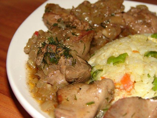 Mod de Preparare: Ceapa si usturoiul se curata si se spala bine. Apoi se taie in bastonase lungi de 4-5 cm. Ficateii de pui se curata, se spala si se pun la fiert in apa colocotita pentru 5 minute. Apoi se scot din apa (eventual se spala). Ceapa si usturoiul se oparesc intr-o oala cu apa clocotita (data jos de pe foc) pentru 5 minute. Intr-un vas pentru cuptor se pun ficateii si deasupra se pun ceapa si usturoiul. Apoi se pun sucul de rosii si pasta de tomate amestecate impreuna si paharul cu vin. Se sareaza si se pipereaza dupa gust. Vasul se da la cuptor pentru 40 de minute. Deasupra de pune marar taiat marunt.