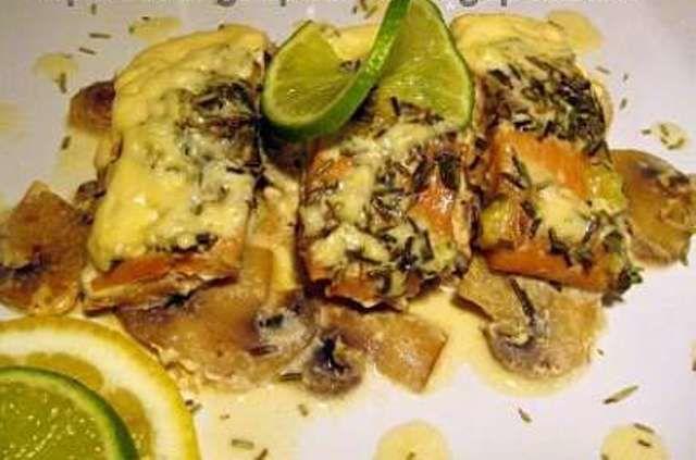 Mod de preparare: Ciupercile se curata si se taie in felii subtiri. Fileul de somon se portioneaza. Ceapa verde se curata si se taie marunt. Se unge cu 1/2 din cantitatea de unt un vas pentru cuptor. Apoi se pun ciupercile taiate pe fundul vasului. Deasupra se aseaza fileurile de somon peste care se presara cepa verde si rozmarinul (eu nu am avut rozmarin verde, crengute, asa ca am folosit din cel uscat). Restul de unt se taie in cuburi mici si se pun desupra, din loc in loc. Peste acest amestec se pune o jumatate de cana cu apa si se da la cuptor, la foc mediu pentru 25 de minute. Apoi se pune smantana pentru gatit deasupra, se pun zeama de la o jumatate de lamaie, sare si piper, si se mai da la cuptor pentru 3-5 minute.