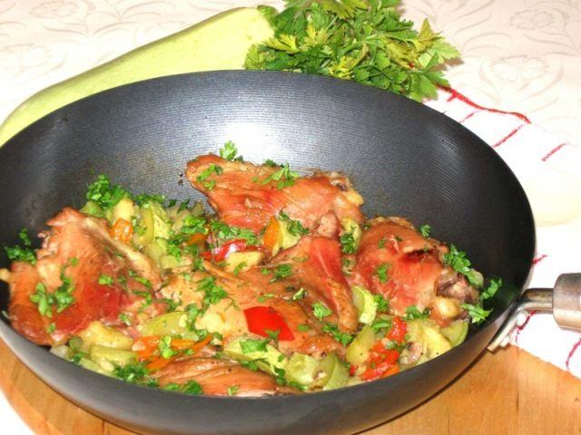 Mod de Preparare: Curatam si spalam copanelele de pui. In ulei incins calim puiul frecat cu sare si piper. Zdrobim cu lama cutitului cateii de usturoi si-i punem peste pui. Dovleceii si ardeii se taie bastonase subtiri, ciupercile le feliem si le adaugam la mancare. Turnam vinul si lasam sa fiarba totul la foc mic, acoperit cu capac, pentru 10 minute. Cand legumele sunt al dente punem rosiile si mai lasam 5-6 minute. Servim preparatul cald, ornat cu patrunjel.