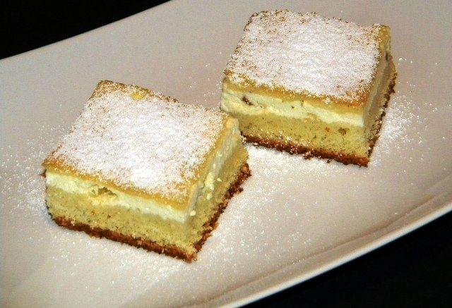 Mod de Preparare: Ungeti forma cu unt topit. Amestecati 2 oua cu 100 g zahar, sarea, pana cand volumul se dubleaza si devine ca o crema. Adaugati restul de unt topit, smantana lichida, amestecati pana compozitia se omogenizeaza. Amestecati faina cu praful de copt, dupa care puneti in compozitie, continuand sa amestecati, pana devine omogen. Rezulta un aluat lichid. Separat amestecati branza cu restul de zahar, zaharul vanilat si un ou. Branza am lasat-o destul de uscata. Preancalziti cuptorul la 180°C. Puneti in forma compozitia cu branza, pe un strat si apoi acoperiti si egalizati cu compozitia cu faina. Puneti in cuptor 45 minute, incercati cu scobitoarea daca iese uscata si lasati prajitura sa se raceasca in cuptorul cald. Dupa ce sa racit, pudrati cu zahar.