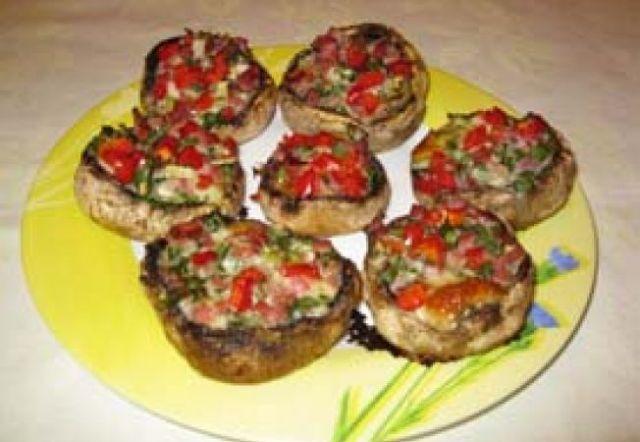 Mod de Preparare: Incepem prin a spala bine si repede ciupercile, apoi le rupem cotorul si il maruntim. Intr-o tigaie punem o putin ulei de masline si pasta de ardei sau ardeiul taiat cubulete mici si il lasam pana se inmoaie putin, cam 3 minute si adaugam si pieptul de pui taiat cubulete. Lasam pe foc pana puiul este gata cam 7-8 minute, condimentam cu sare si piper. Luam ciupercile si le saram si piperam apoi amestecam branza cu pieptul de pui si patrunjelul tocat apoi imparim umplutura in 8 parti si le punem in ciuperci. Ciupercile le punem pe o tava cu hatrie de copt si le dam la 200 grade in cuptorul preincalzit pana branza se topeste si capata o culoare aurie (cam 20 minute).