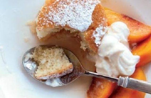 Mod de preparare: Cuptorul se preîncălzeşte la 190 de grade Celsius. Se unge un vas de Jena (22×33) cm cu unt. Ouăle se bat spumă cu laptele. Se adaugă 270 g de zahăr şi se amestecă, folosind un mixer, până când ouăle se deschid la culoare. Separat, făina se amestecă bine cu praful de copt şi sarea. Amestecul se încorporează treptat în spuma de ou, apoi se adaugă untul topit şi se omogenizează. Aluatul se toarnă în vasul de Jena şi se coace 30 de minute, până când devine auriu. Când este gata, se scoate şi se răceşte pe un grătar. Între timp, 50 g zahăr se amestecă bine cu lichiorul de piersici. Se adaugă piersicile tăiate şi se lasă să-şi ia aroma cel puţin 15 minute, la temperatura camerei. Din când în când, piersicile se întorc. Frişca se bate cu zahărul farin şi esenţa de vanilie până se întăreşte. Prăjitura se taie şi se serveşte cu piersici însiropate şi frişcă.