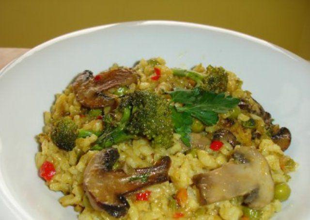 Mod de preparare: Orezul se spala si se fierbe in 2 cani de apa, cca 20 min - la foc mic, cu sare si piper. Ceapa se curata, se spala si se taie marunt. Ciupercile se spala, se curata si le taiem felii. In timp ce fierbe orezul, punem uleiul la incins si calim ceapa, pana cand devine sticloasa. Se scoate intr-un vas iar in uleiul ramas calim ciupercile, pana capata o culoare usor aurie. Orezul fiert se amesteca cu ceapa calita si se potriveste de sare si piper. Deasupra se adauga ciupercile si patrunjel verde tocat marunt. Dupa preferinta se poate adauga si bulion de rosii. Este o mancare de post, dar poate fi servita si ca garnitura alaturi de friptura.