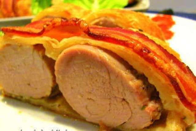 Mod de Preparare: Se zdrobeste usturoiul si se freaca cu 1 lingura de ulei, se toaca marunt rozmarinul si se adauga usturoiului. Cu jumatate din amestecul de usturoi se unge muchiuletul dupa ce a fost sarat si piperat. Se da la frigider pt 2 h. Intr-o tigaie se incing cateva linguri de ulei si se pun la „sigilat' muschiuletii. Se rumenesc usor pe fiecare parte si se scot pe o farfurie. Apoi se ung cu restul de usturoi si rozmarin. Se intinde foaia de aluat foietaj se taie in functie de marimea muchiuletilor, avand grija ca aluatul sa acopere carnea pe toate partile. Se pune carnea si se imbraca in aluat, capetele se umezesc cu putin apa ca sa se lipeasca. Feliile se slaninuta se pun la distanta de 2 degete una de alta peste aluat si se ruleaza in folie ca sa ajute slaninuta sa adere la foietaj. Eventual puteti folosi scobitori sa printeti capetele fasiilor de slaninuta ca sa ramana prinse in crusta. Se gaureste aluatul din loc in loc cu furculita ca sa iasa aburul in timpul coacerii. si se da la cuptorul preincins la 190 grade si coceti pana ce crusta s-a rumenit bine (30 min aprox) Se lasa sa se odihneasca inainte de taiere astfel sucurile se vor reabsorbi in carne si va fi foarte frageda.