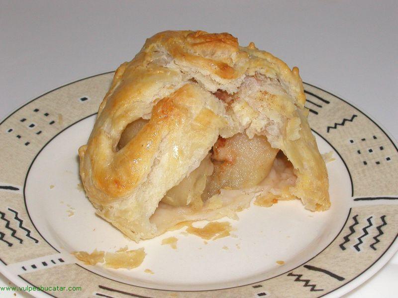 Umplutura: Se curata merele de coaja si cotor. Se imparte coca in 8 parti si se intind patrate, suficient de mari cit sa le acopere. Se pune in fiecare mar cate o lingurita de zahar si scortisoara . Se iau colturile opuse si se prind in varful marului, apoi se iau celalalte doua si se unesc, acoperind astfel marul. Se pune in tava foaie de copt (pergament), apoi merele. Se coc la temperatura de 350°F, 35 minute, in cuptorul bine incins. Cand s-au rumenit sunt gata. Se pot incerca cu o furculita daca s-au copt merele. Depinde si de soiul de mere folosit.