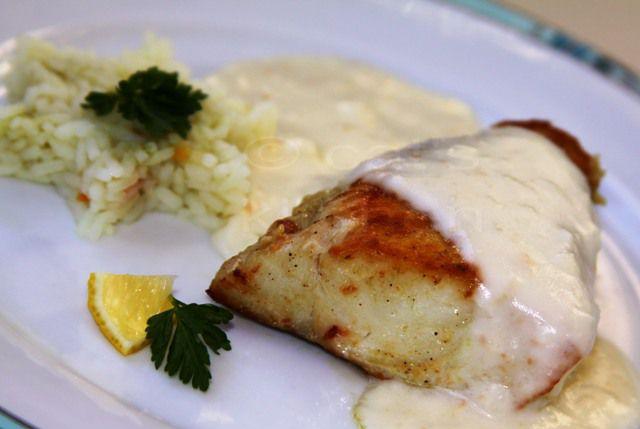 Mod de preparare: Puneti pestele intr-o tigaie joasa si potriviti de sare si piper. Adaugati vinul si un sfert de cana de apa. Inabusiti la foc mic pentru 15-25 de minute. Taiati coaja painii si prajiti cate o felie de paine pentru fiecare bucata de peste. Cand pestele este gata, scurgeti sosul din tigaie intr-un alt recipient. Adaugati faina si 3 linguri de unt si aduceti la fierbere, la foc mic, pana ce obtineti o pasta omogena. Luati sosul de pe foc, potriviti de sare si amestecati inauntru oul batut cu o lingura de unt. Luati si ciupercile deja inabusite si adaugati-le in sos, alaturi de smantana, aducand din nou la fierbere la foc mic pana cand sosul capata o consistenta cremoasa. Puneti patrunjelul tocat si lasati recipientul acoperit inca 10 minute. Puneti painea prajita pe un platou incalzit si cate un file de salau pe fiecare felie. Adaugati sosul de ciuperci si vin. Serviti cu orez sau cartofi natur.