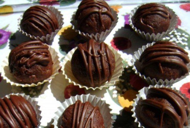 Mod de Preparare: Pentru sirop, se pun apa sau laptele cu zaharul si cacaoa, dupa gust, la fiert, si se lasa pana se obtine un sirop bine legat. Biscuitii se zdrobesc fin la robot sau se dau prin masina de tocat. Peste ei adaugam margarina moale, cele doua linguri de cacao, stafidele, nuca, esenta de rom si o parte din sirop (rece). Amestecam bine cu mainile pana se omogenizeaza. Compozitia trebuie sa fie destul de umeda; daca ni se pare uscata mai turnam sirop si amestecam din nou. Din pasta rezultata se iau mici bucatele care se modeleaza intre palme, se pune o visina fara sambure sau 2-3 afine. Formam bilute pe care le asezam pe un gratar. Ciocolata neagra se topeste la microunde in doua-trei etape a cate 30 de secunde. Decoram bombonelele aromate si le asezam pe hartii speciale. Sunt delicioase, aromate, moi si crocante la suprafata.